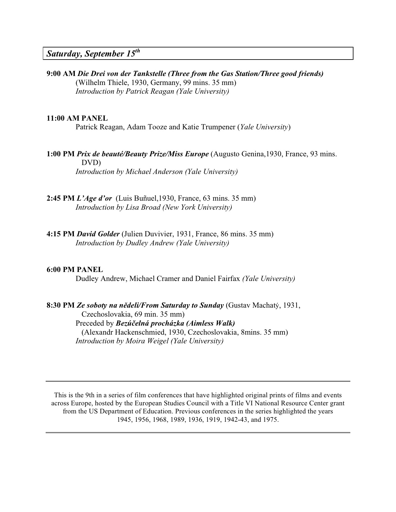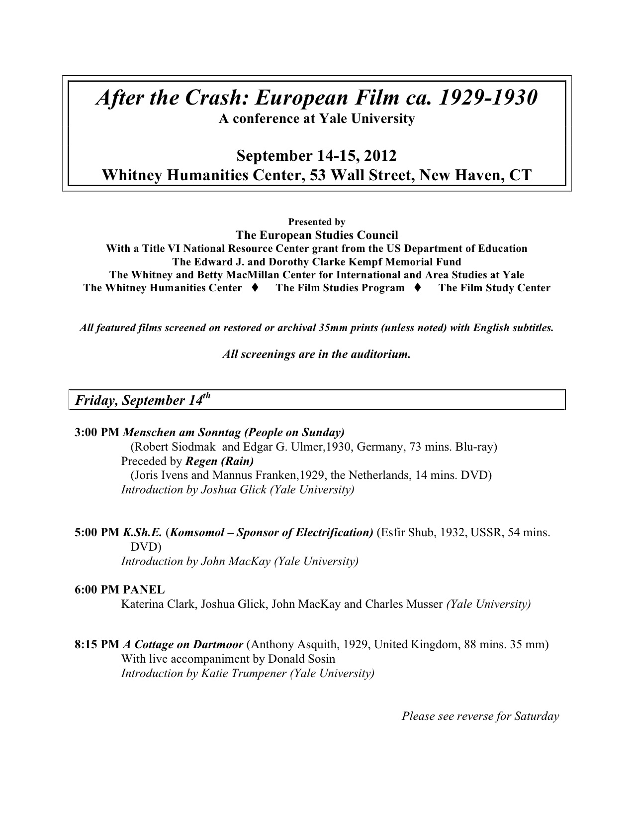 In this conference various members of the Yale Film Studies faculty, their friends and graduate students get together to look at a group of films made in different European countries at roughly the same time. What do they share? In general, this year was remarkably coherent, although there was one rather odd outlier: Esfir Shub’s K.Sh.E. (Komsomol – Sponsor of Electrification) (1932). The discussion was—as usual—provocative and helpful.