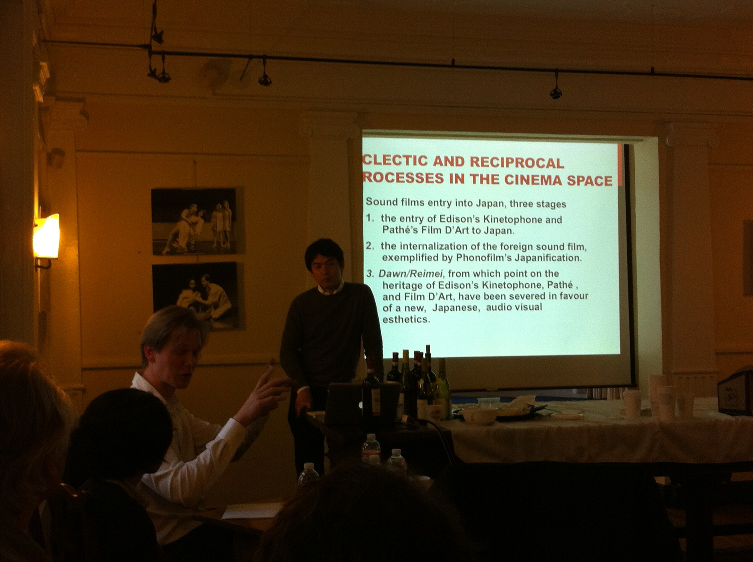 Nordstrom’s exploration of the way records and songs were incorporated into silent Japanese cinema was a fascinating surprise, at least to this non-expert. His presence also reminded Yale students that Waseda has a graduate population that is as international as our own. Daibo’s work on the long history of syncrhonous recorded sound in Japan took an original turn as he explored the ways in which successive waves of sound technology went through a process of Japanification.