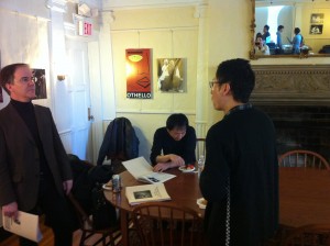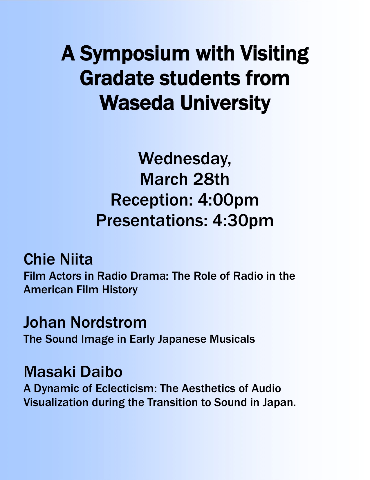 In an earlier posting (Back in Japan: A Conference on Acting––with Jet Lag), I mentioned that three graduate students from Waseda University (Tokyo, Japan) would be coming to Yale to present their scholarship. The story in brief: They would attend the Society for Cinema and Media Studies conference in Boston (March 21-25, 2012), but their university expected them to return home immediately–with no time to go sightseeing or do research. And no time to get over their desynchronosis (otherwise known as jet lag). It was subsequently so arranged that they gave presentations at Yale a few days after SCMS (on March 28th) buying them some extra time in the US. Since DAIBO Masaki and Johan Nordstrom were reprising their SCMS papers, they headed to New York and did research at Columbia University’s library which has a very strong archive of Japanese film material. NIITA Chie, who had been a pre-doc at Yale for a year, spent her time preparing a presentation on her recently defended dissertation. Moreover, the resulting symposium provided an opportunity for Yale Film Studies graduate students to meet their Waseda counterparts––and obviously vice versa.